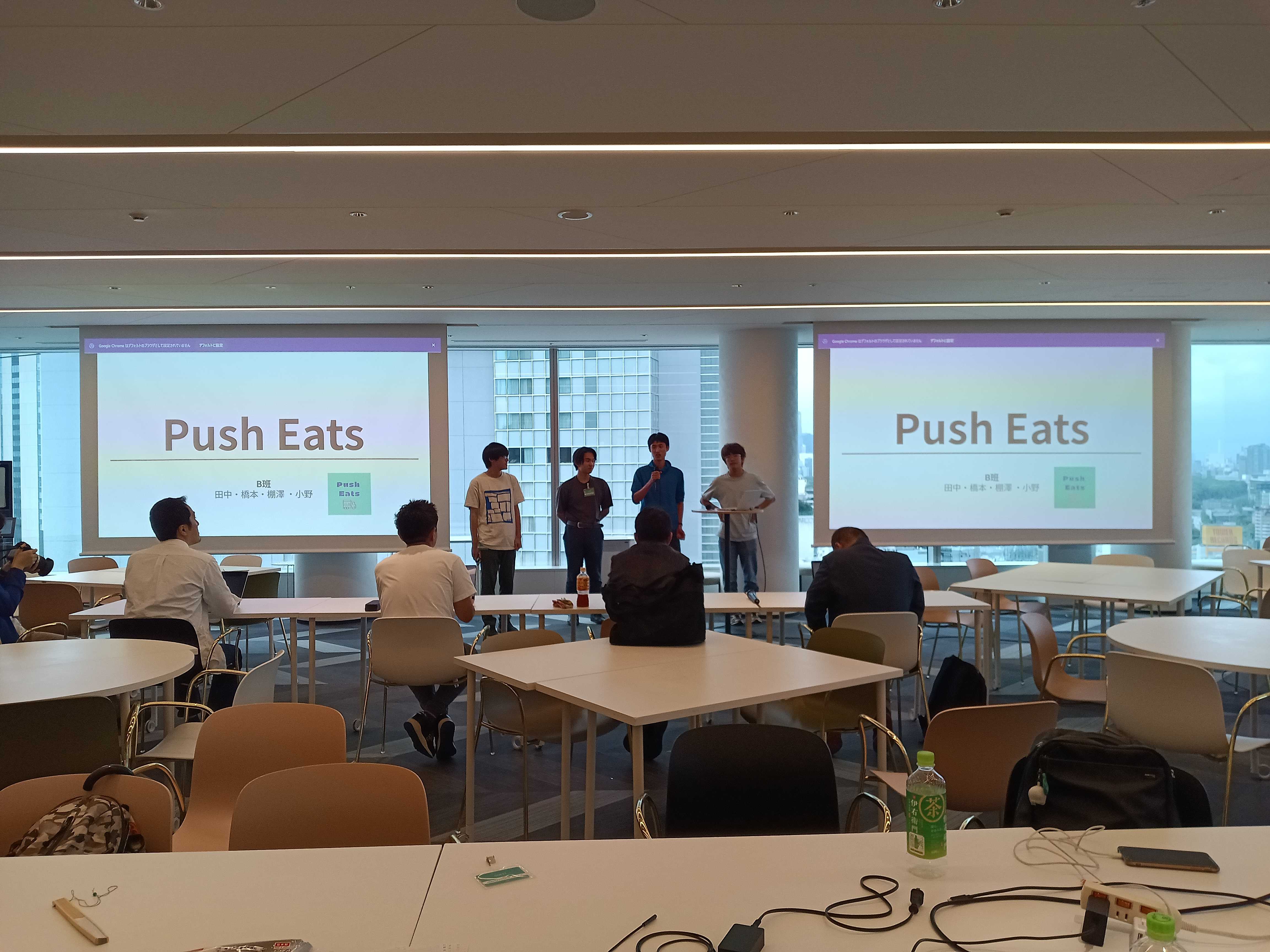 チーム B は、おすすめのご飯屋さんを AI が自動的に提案してくれる「Push Eats」を開発しました。位置情報やお店の混み具合のデータを使って、 AI がお店を提案してくれるアプリで、これを使えば日々のお店選びがより簡単になり、店選びに悩むことがなくなります。